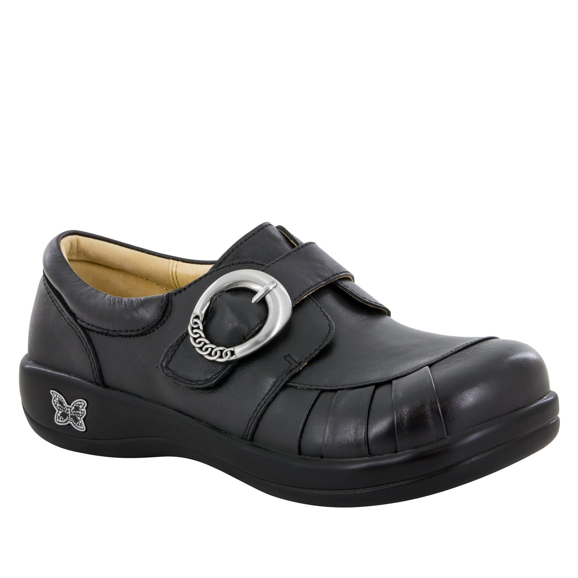 Shop fashionable Alegria shoes at Alamo Shoes in Chicago. It features an adjustable buckle strap for a custom fit, a lab-rated slip resistant outsole and stain-proof leather coating. The leather covered insole allows for your feet to naturally breathe, leaving them feeling fresh and dry. The cork, memory foam and latex loaded footbed creates a "perfect fit" by forming to the natural contours of your foot.