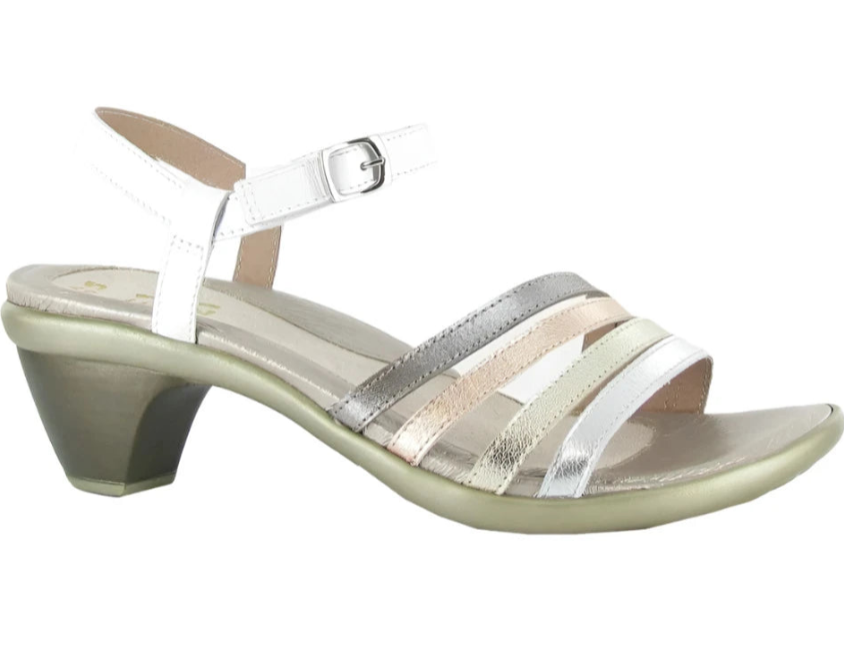 Delicate and strappy, Naot Current is a must-have minimalist evening sandal. This style features a supportive backstrap and a buckle closure that allows adjustability. Naot's anatomic cork & latex footbed is wrapped in leather with a microfiber center to prevent slipping and molds to the shape of the foot with wear. The Avantgarde Collection features a TPR sole with a metal shank. This sole offers the look of a 2" heel without the feel. Get yours today at Alamo Shoes in Chicago.