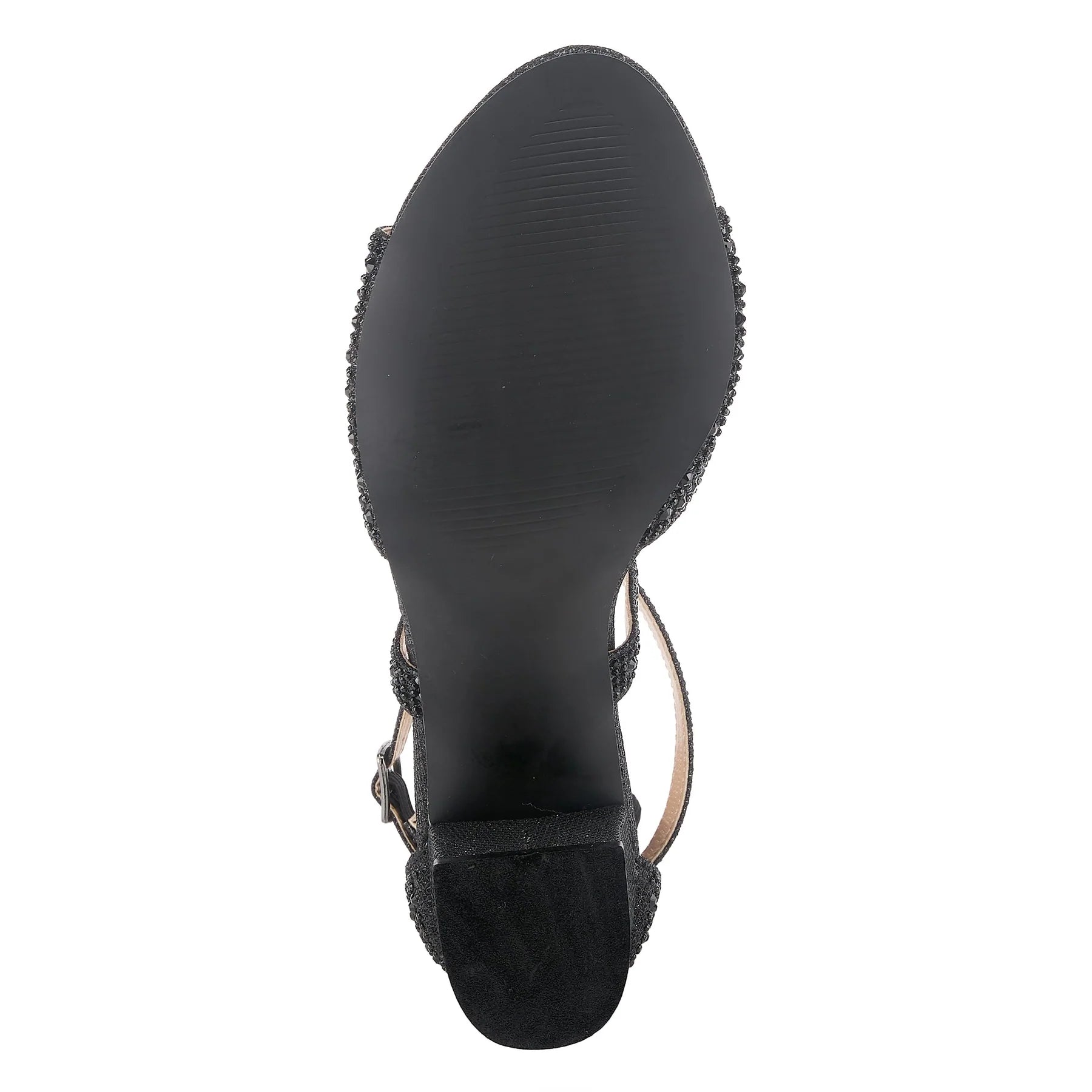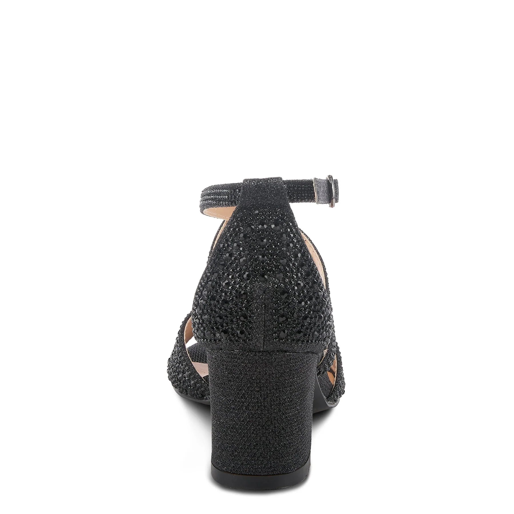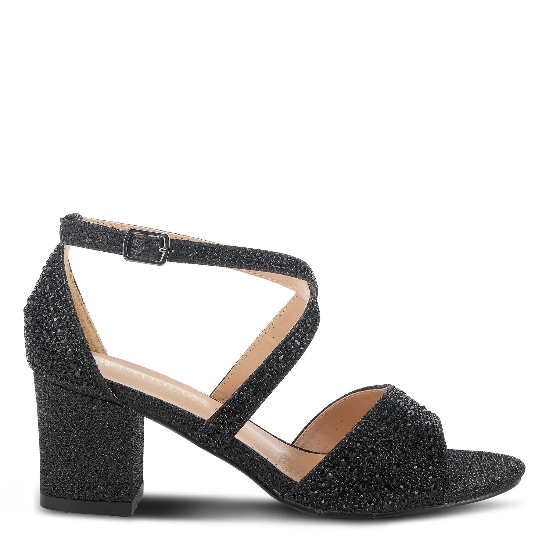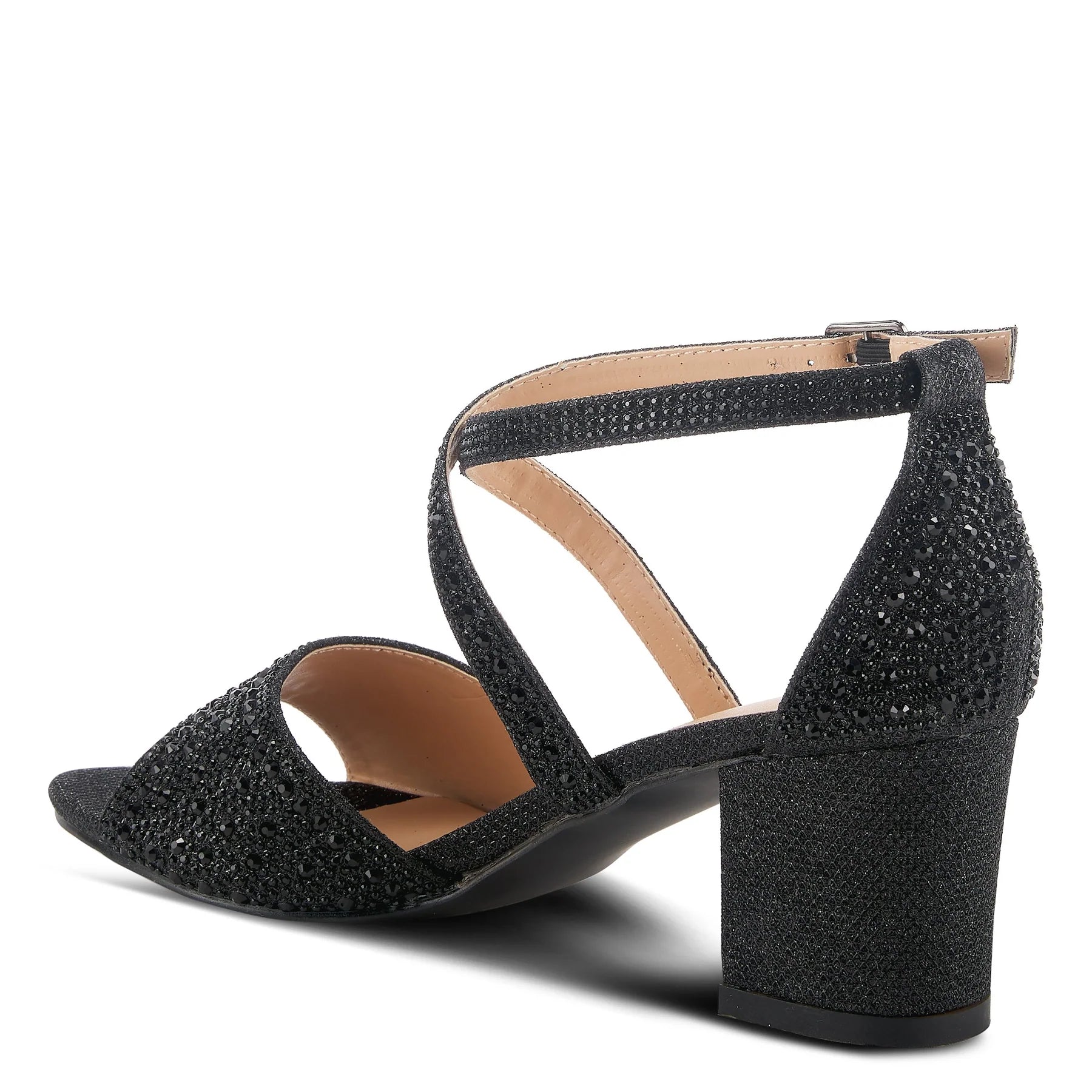 Classy criss-cross strapped, open-toe sandal starring beautiful tonal crystals on a comfort blocked heel. Now available at Alamo Shoes in Chicago.