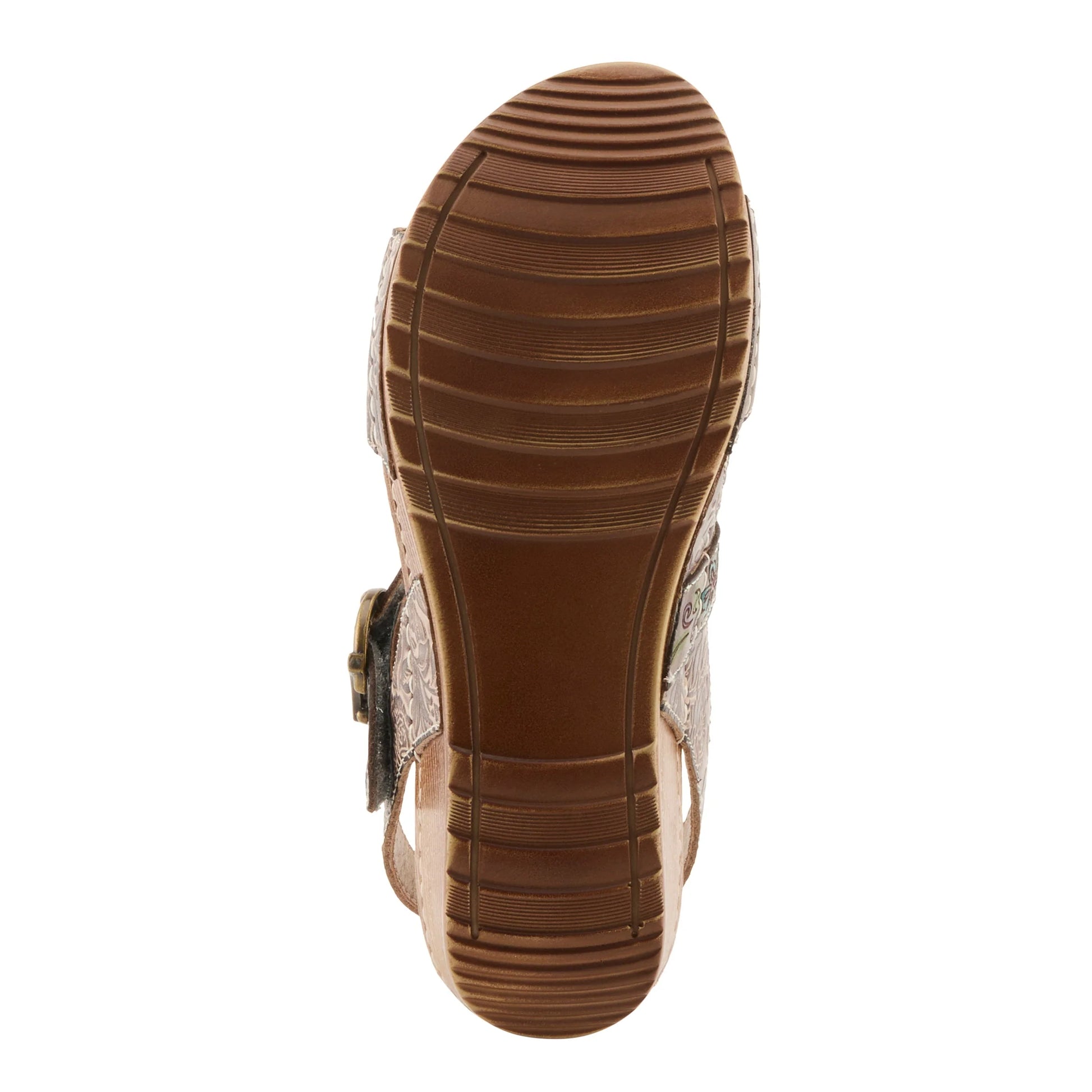 This wedge sandal offers timeless craftsmanship with an artistic twist. The hand-painted leather upper showcases embossed floral patterns, creating depth and character across the straps. Two round, antique brass buckles add a touch of refinement while providing adjustability for a customized fit. With its supportive backstrap, softly cushioned microsuede footbed, and lightweight cork-inspired wedge, this style balances beauty and comfort with ease.